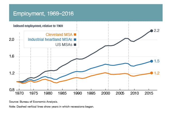 - Between 1969 and 2016, employment in the Cleveland MSA grew more than 20 percent. But this growth was much weaker than that in either the industrial heartland or the nation: The nation’s employment grew by more than 100 percent, and the average industrial heartland MSA saw its employment level grow by 50 percent.