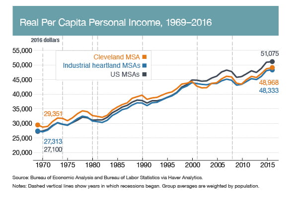 - In 1969, the Cleveland MSA was among the top 10 percent of MSAs for per capita income. Despite declines in per capita income following the large shocks to manufacturing employment experienced in the late 1970s and early 1980s, the Cleveland MSA’s per capita income remained above average until 2000. The decline in manufacturing experienced in the Cleveland MSA between 2001 and 2010 appears to have further dampened income growth; this which experience is consistent with the experience of other industrial heartland MSAs that suffered income losses along with manufacturing losses. The Cleveland MSA is now notably below the national MSA average for per capita income.