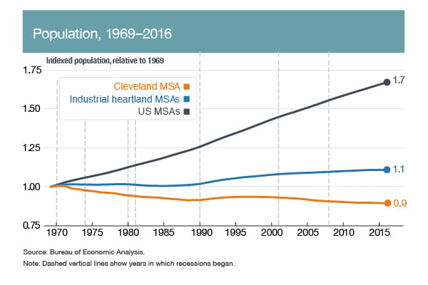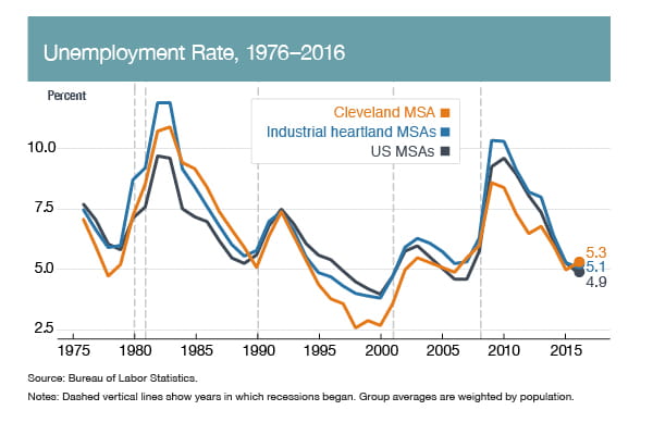 This report examines the economic performance of the Cleveland metropolitan statistical area (MSA) from 1969 to 2016 in terms of employment, unemployment, population, and real per capita personal income levels. While comparisons are made to national averages, a more relevant peer group for the Cleveland MSA is that of the MSAs of the industrial heartland: areas located in and near the Midwest that, like Cleveland, also have historical concentrations in manufacturing. Even when the Cleveland MSA’s performance is compared to that of the other industrial heartland MSAs rather than to that of the nation, it is often somewhat weaker; however, the shared timing of adverse economic developments, including multiple shocks to manufacturing employment, points to the significant challenges faced by most industrial heartland MSAs.